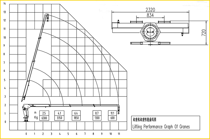 ☆6.3吨4节臂吊机,工作半径11米,举升高度12.8米,全部伸出可吊600公斤;