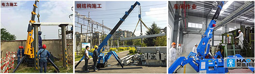 微型履带式蜘蛛起重机因其适应不平坦的路面,能爬坡,通过性好,适合狭窄的空间,已被广泛应用到电力施工,玻璃幕墙,车间厂房等。