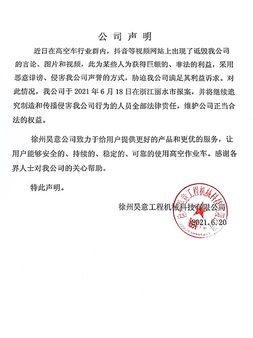 近日在高空车行业群内,抖音等视频网站上出现了诋毁我公司的言论、图片和视频,此为某些人为获得巨额的、非法的利益,采用恶意诽谤、侵害我公司声誉的方式,胁迫我公司满足其利益诉求。对此情况,我公司于2021年6月18日在浙江丽水市报案,并将继续追究制造和传播侵害我公司行为的人员全部法律责任,维护公司正当合法的权益。