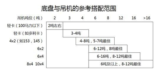 对于底盘与吊机的匹配,因为遇到的工况和需求各不相同,还没有一个确切的范围,根据以往的购车经验,100马力以下轻卡,如东风福瑞卡可以安装2吨左右的吊机;东风多利卡,重汽等类型的轻卡可以安装3-4吨的吊机;145,153级别的4x2中卡可以安装4-8吨的吊机,5-6吨吊机(起重与运输能力平衡);6x2底盘可以安装6-12吨吊机,8吨吊机为搭配;6x4底盘可安装6-16吨吊机,8-12吨为佳;8X4底盘较6x4底盘还可安装更大吨位的底盘。