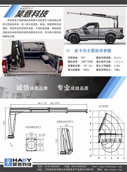 现在的人工成本越来越贵,这种皮卡车装小吊机可以很大程度上代替人工,我公司针对皮卡车开发了一款专用小型起重机,现在在国内是体积小、重量轻、操作方便的产品,其起重量可以达到800kg,工作幅度可以达到3.63m,在吊臂全部伸出情况下,可以起重200kg,其自身重量仅为150kg,满足皮卡车的各项需求。