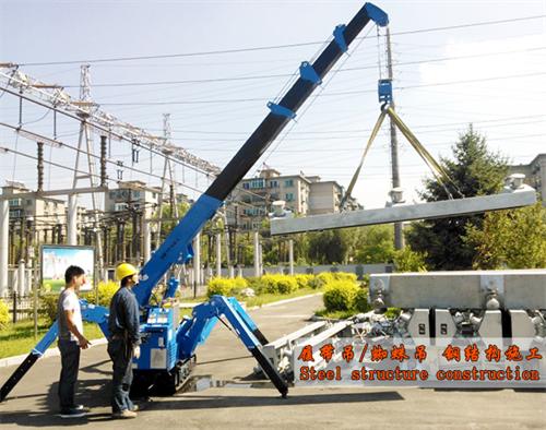 蜘蛛履带式起重机,吊机形似蜘蛛,下车履带式结构而命名。因其具有稳定性好,载重能力大,防滑性能好,对路面要求低等优势,已广泛应用。小型蜘蛛履带式起重机主要用于狭窄空间的汽车发动机车间设备检维修,电力检维修,化工车间检维修,以及建筑幕墙安装,高铁车站的建设,及陵园石材行业等空间狭小的场合使用。