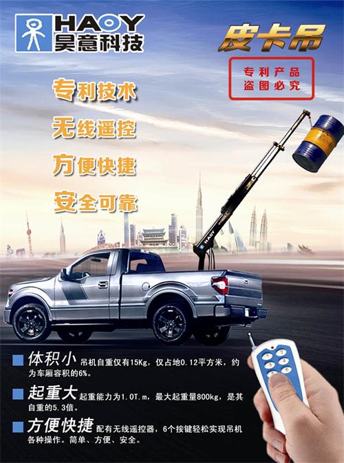 皮卡作为一种既可以载人又可以运输的车型,这几年在国内迅速发展。随着皮卡车的兴起,特别是中高端客户的增加,客户对货物的装卸也有了更高的要求。方便、简单、省力等成了一些客户 的需求。因此我公司针对皮卡车开发了一款专用小型起重机,现在在国内是体积小、重量轻、操作方便的产品,其起重量可以达到800kg,工作幅度可以达到3.63m,吊臂全伸状态下可以起重200kg,其自身重量仅为150kg,满足皮卡车的各项需求。