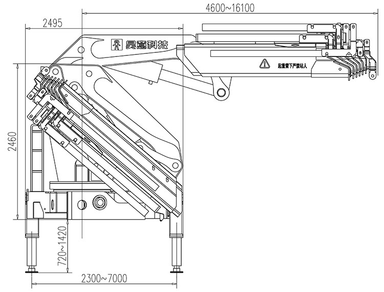2、折臂起重机全缩空间,满足较大的工作幅度,并减轻起重臂的自重、缩小的起重机的安装空间。起重臂所用材料为起重机专用钢材,具有高强度、高刚度等优点,从而从设计时,进一步减轻了起重机的自重。