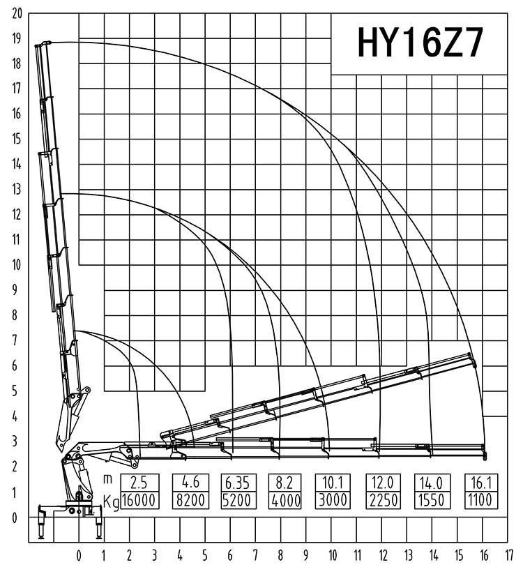 1、16吨8节臂折臂式吊机,作业半径18.1米,全伸出能吊600公斤;举升高度20.6米;