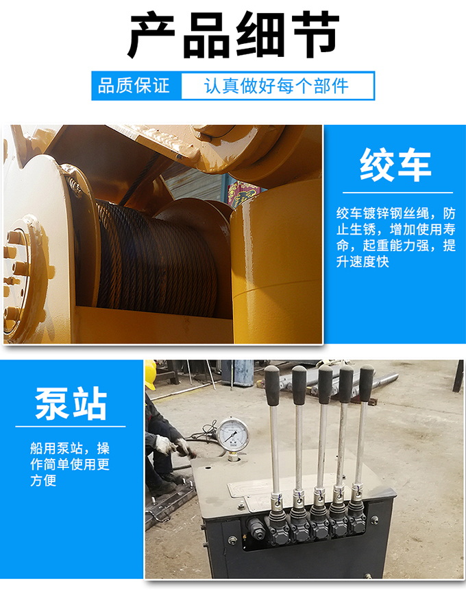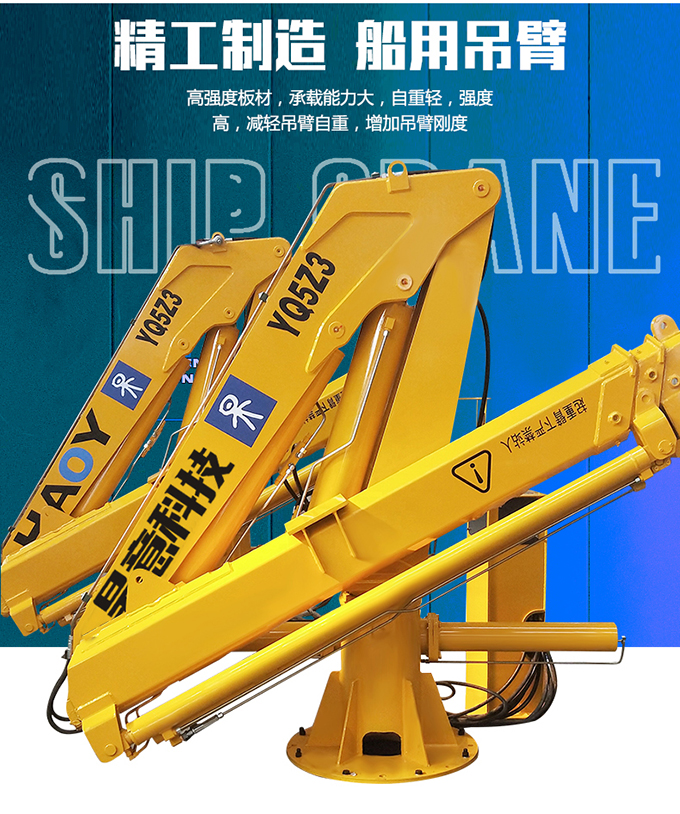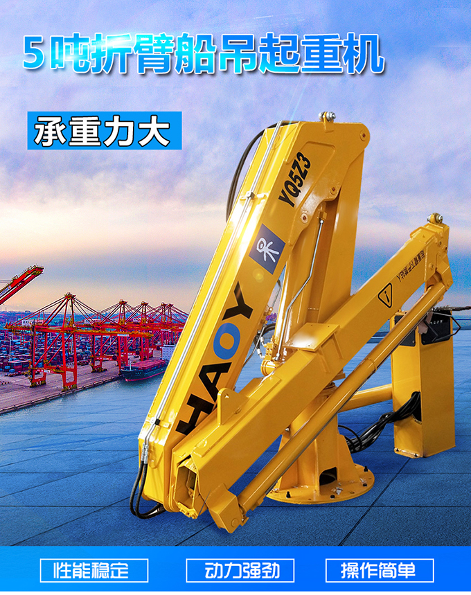 本款船用起重设备是5吨3节臂折臂式甲板起重机,折臂式吊机占用空间小,1050mm,法兰连接,泵站提供动力 ,船舶,码头,港口专用吊机船用吊机有作防锈腐蚀,防氧化等处理,适用于海上复杂的作业环境;
