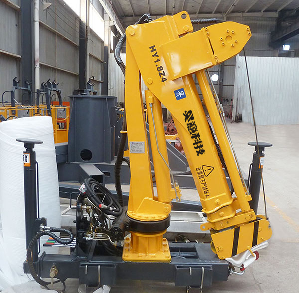 我公司开发的一款专用车载小型起重机,现在在国内是体积小、重量轻、操作便捷的产品,其起重量可以到1800kg,工作幅度可以达到4.6m,在工作幅度下,可以起重550kg,其自身重量仅为310kg,完全满足皮卡车、轻卡等车辆的各项需求。这款液压吊,配有液压支腿和卷扬。